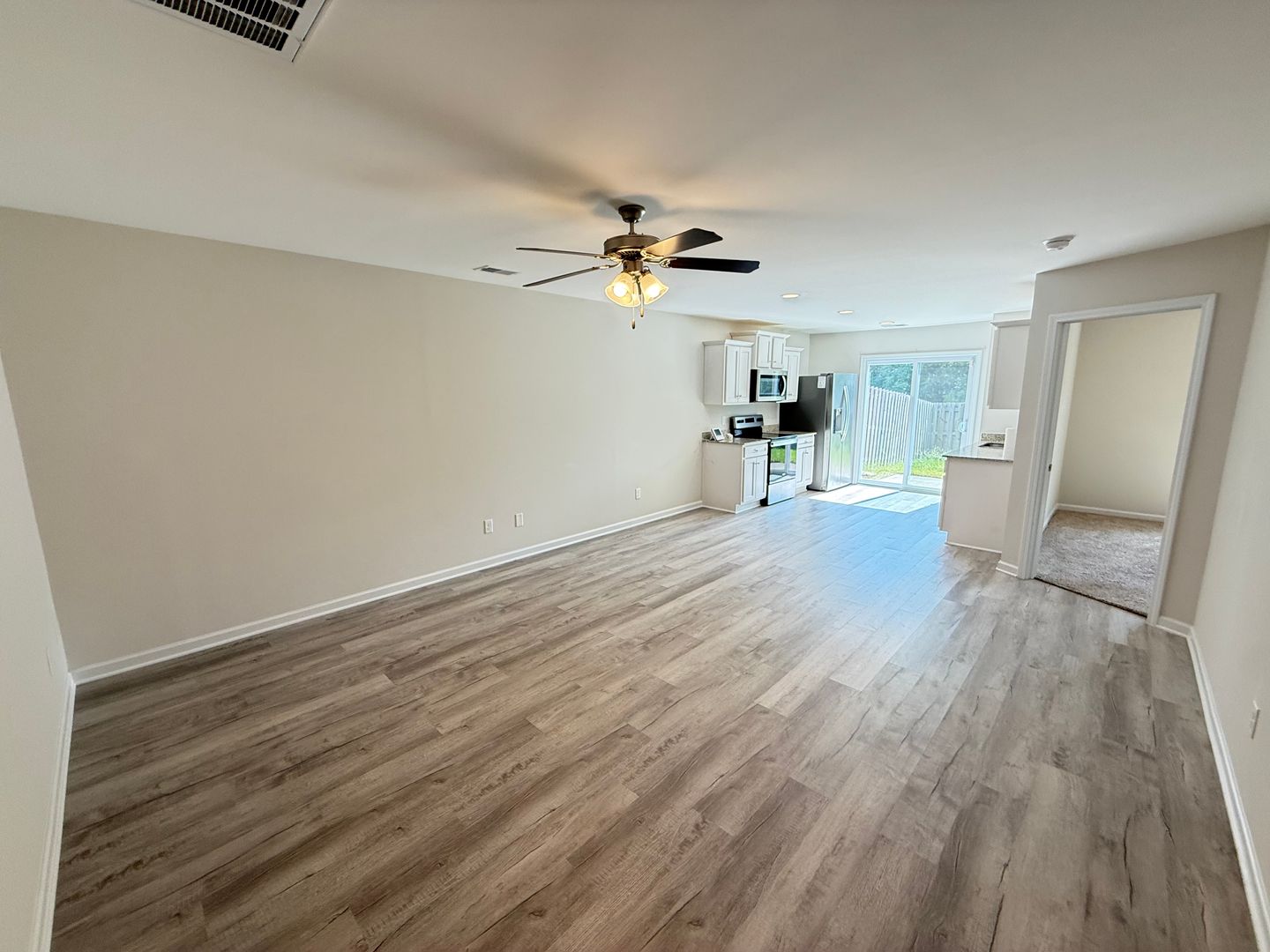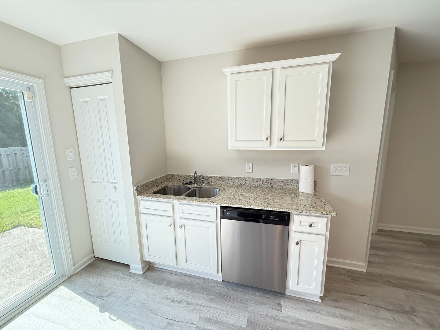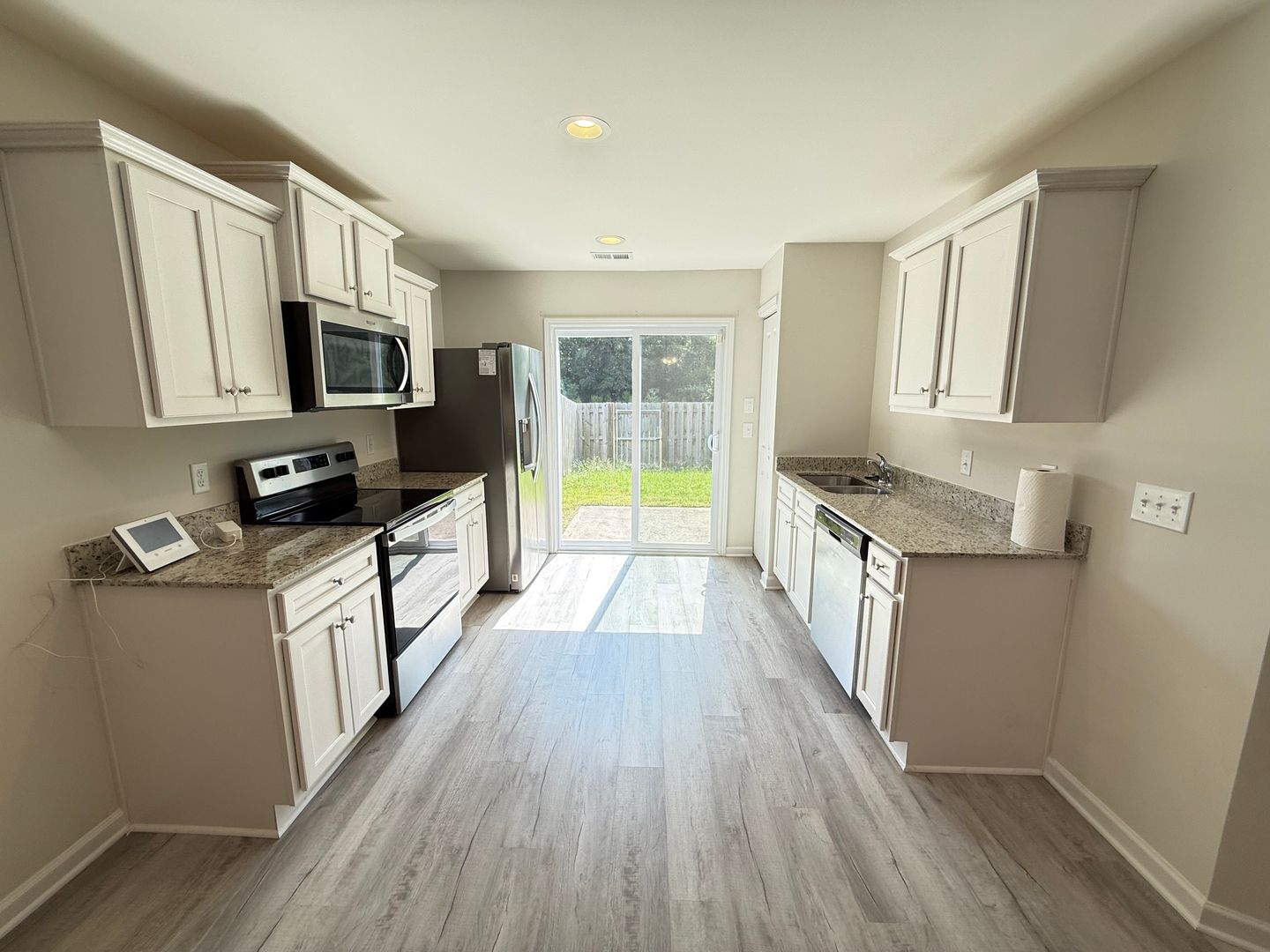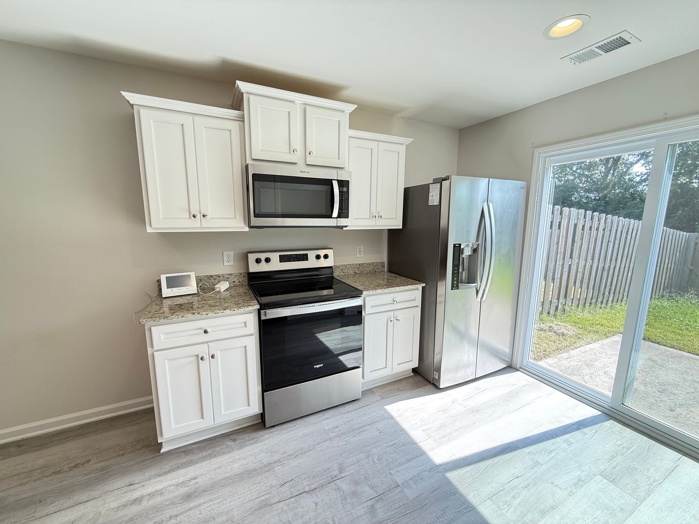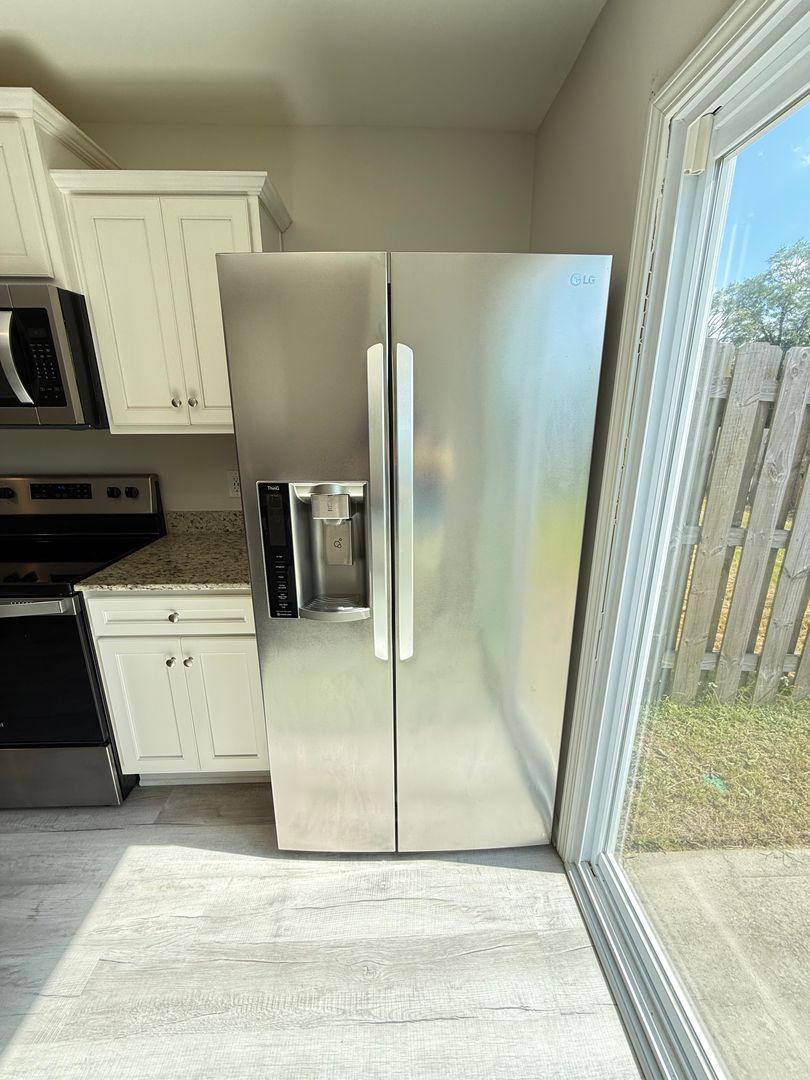 Open living concept with low-maintenance LVP flooring throughout the main areas, offering a modern and clean design ideal for everyday living. Granite countertops featured in both the kitchen and bathrooms for premium quality finishes. Fully equipped kitchen includes stainless-steel appliances (range, microwave, dishwasher, and refrigerator) as well as included washer and dryer for added convenience. Spacious primary suite plus two additional bedrooms with ample closet space—ideal for families or home office setup. Privacy-fenced backyard, perfect for outdoor gatherings, pets, or peaceful relaxation. One-level floor plan with Forced Air/Heat Pump heating and Central Air conditioning to keep climate control comfortable year-round.